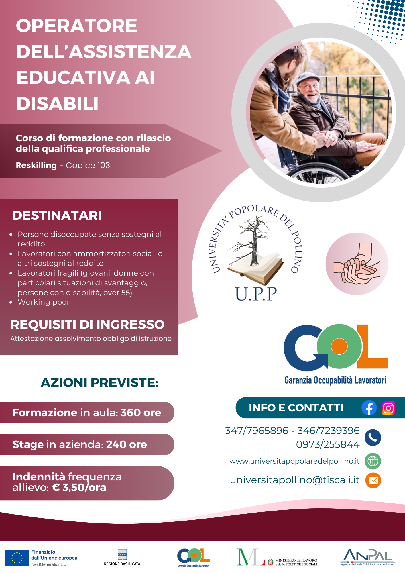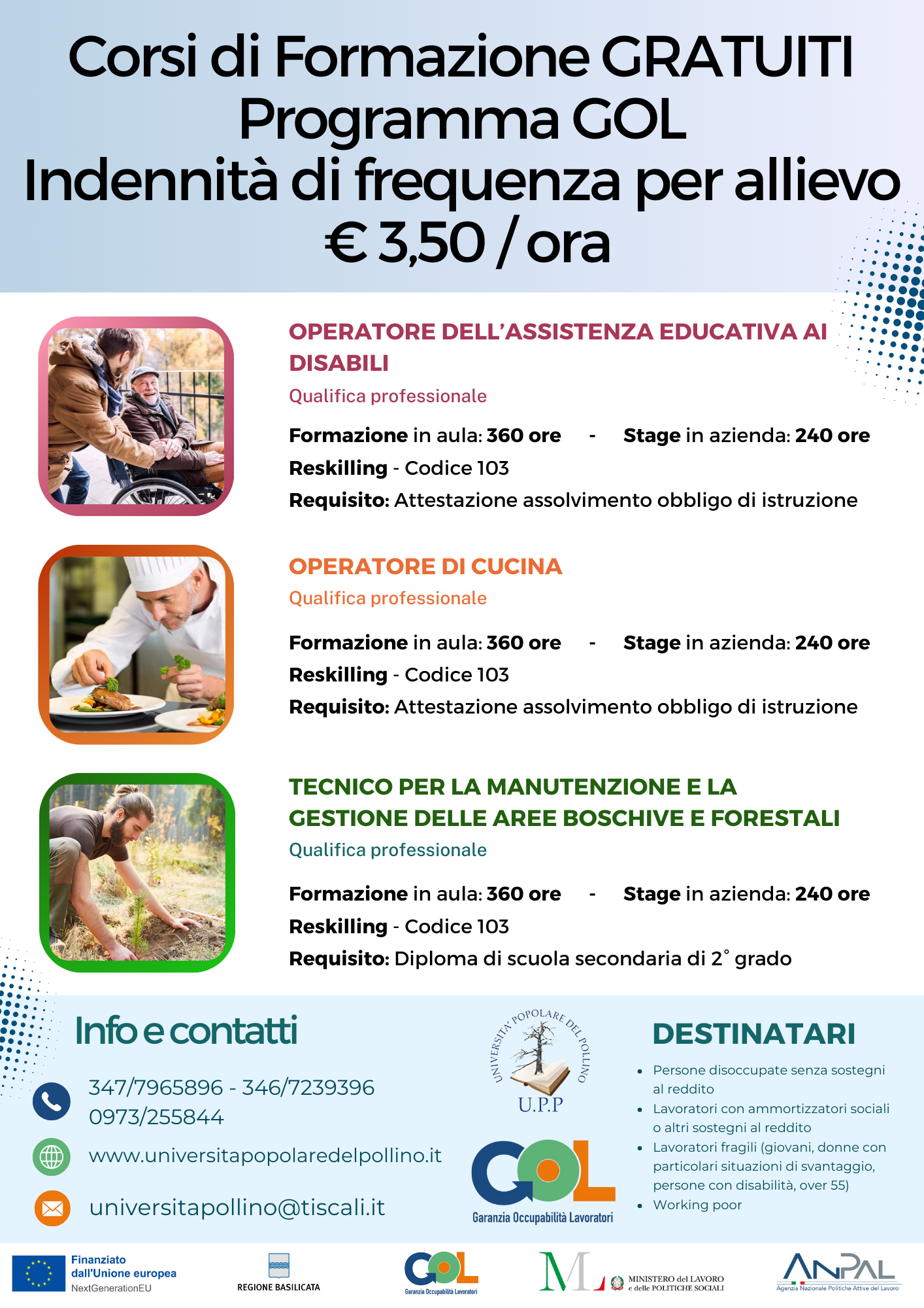 L’Organismo di Formazione “Università Popolare del Pollino“, propone tre percorsi formativi GRATUITI e finanziati dal Programma GOL: